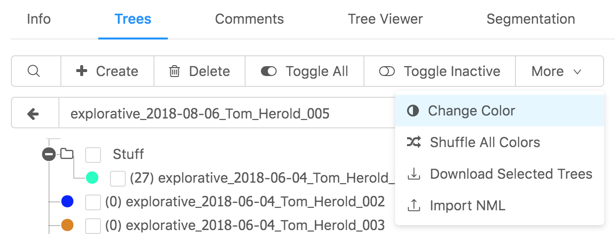 Download Selected Treesoption. From theTrees Tabclick onMoreand selectDownload Selected Treesfrom the menu. All visible trees (checkmark in front of the name) will be downloaded as an NML file. This is especially useful if you need to only download a single tree of an otherwise much larger annotation.